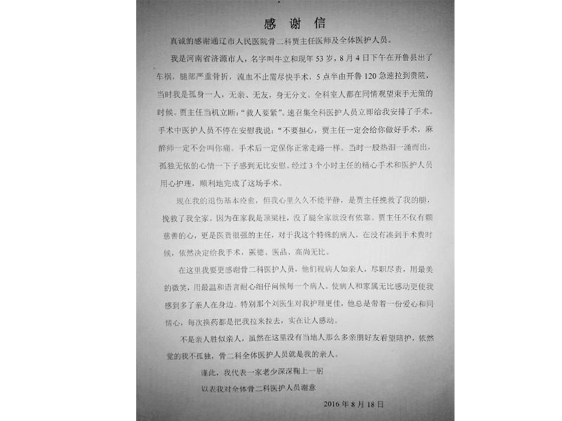 患者牛立和致:通辽市医院骨二科贾运海主任及全体医护人员