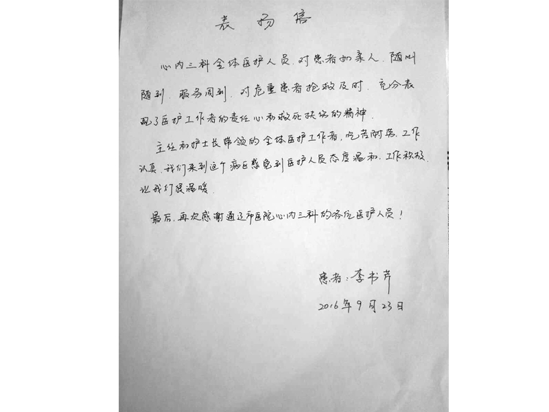 患者李书芹致:通辽市医院心血管内三科全体医护人员