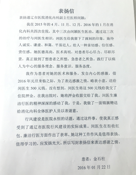 患者金石柱致:通辽市医院消化内科副主任医师闵颖及全体医护人员