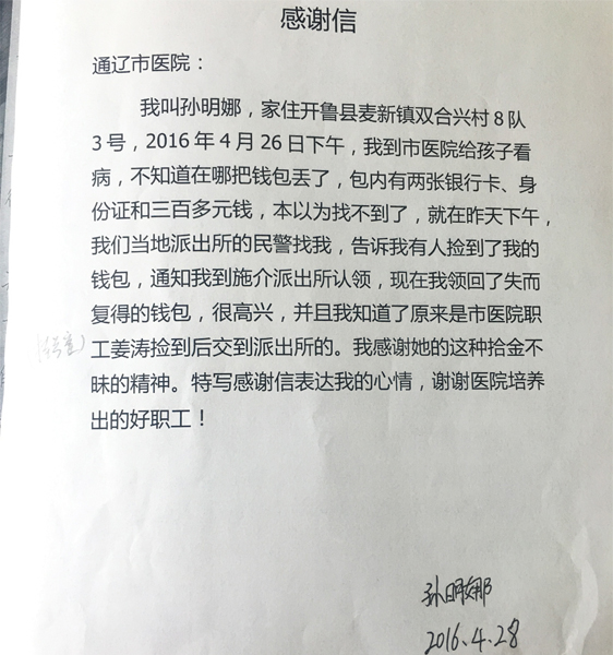 患者孙明娜致:通辽市医院职工姜涛
