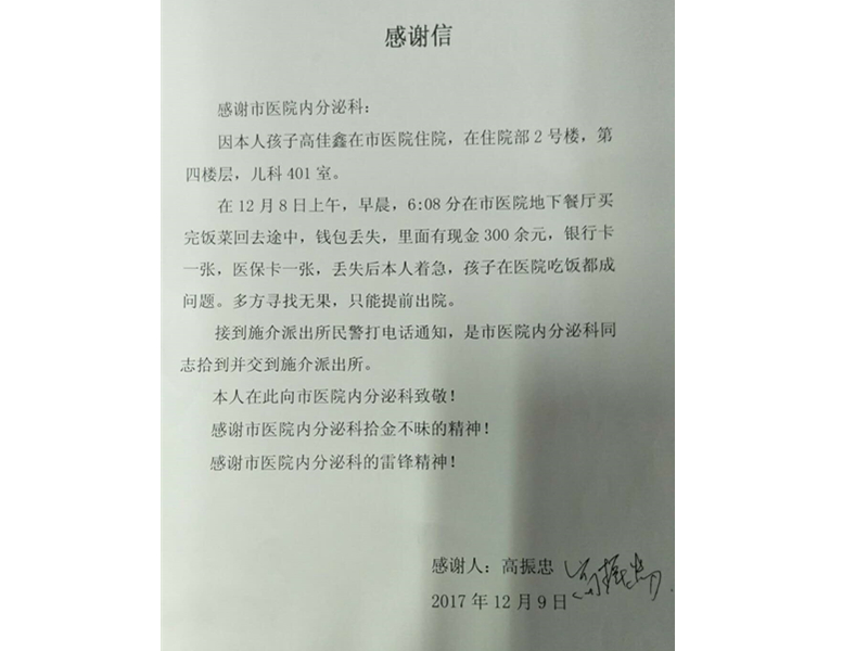 患者家属高振忠致:通辽市医院内分泌科