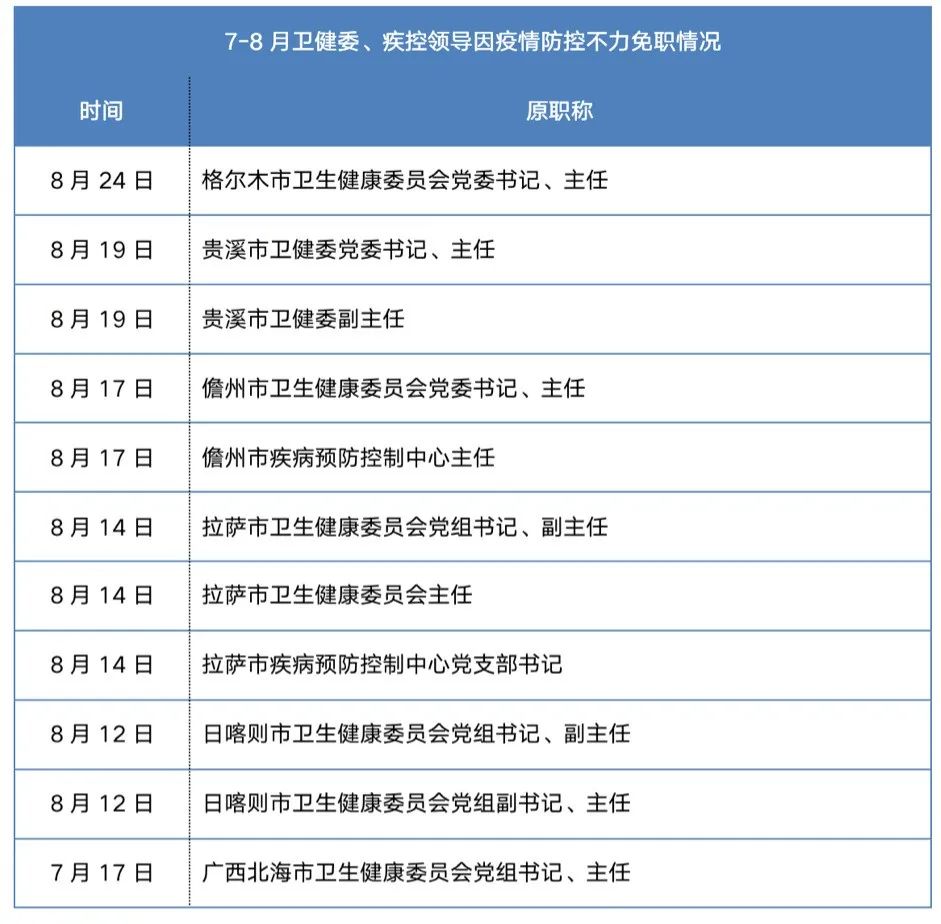 据基层医师公社梳理,7-8月已有10余名卫健委、疾控干部因疫情防控不力被处分。