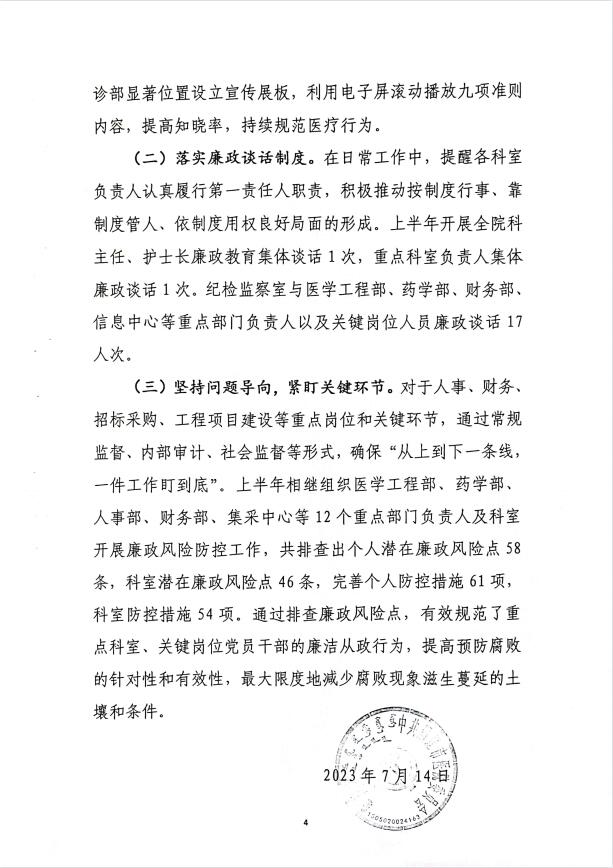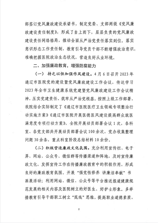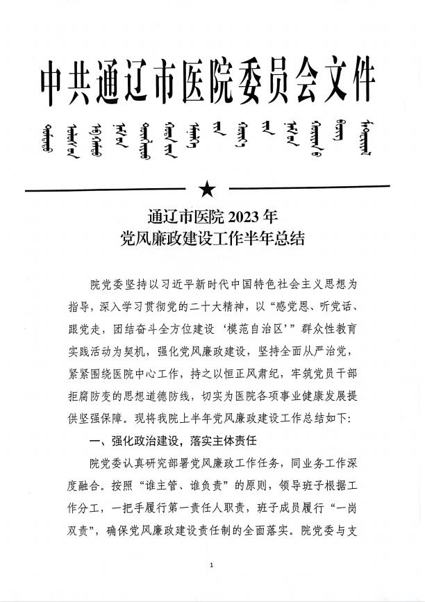 通辽市医院2023年党风廉政建设工作半年总结