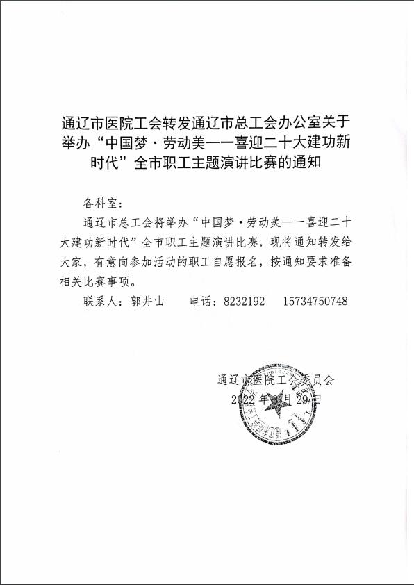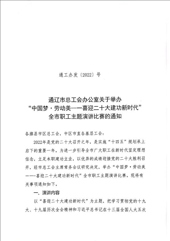 通辽市总工会关于举办“中国梦·劳动美—喜迎二十大建功新时代”全市职工主题演讲比赛的通知