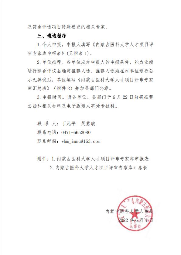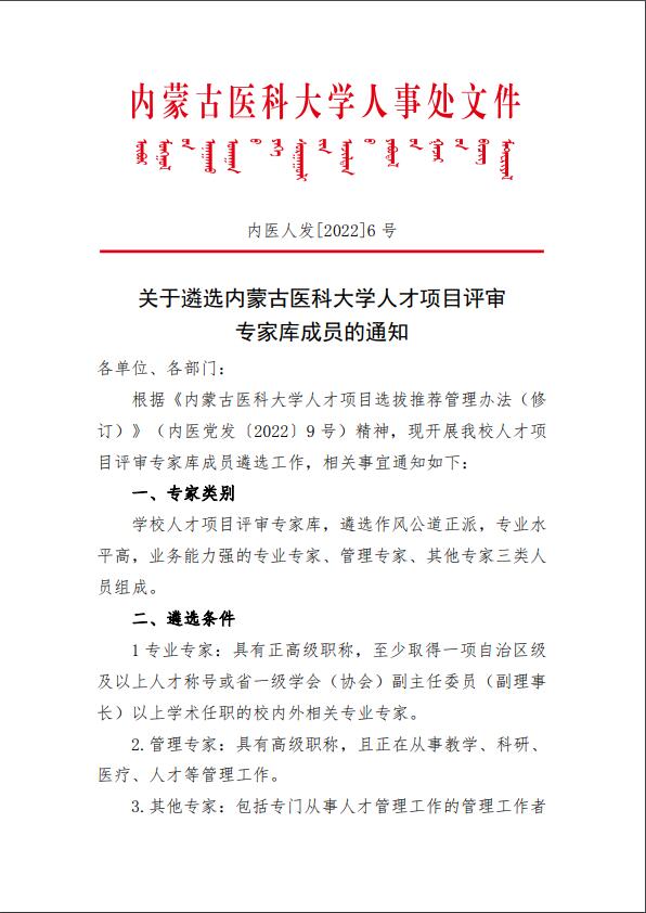 关于遴选内蒙古医科大学人才项目评审专家库成员的通知(内医人发[2022]6号)