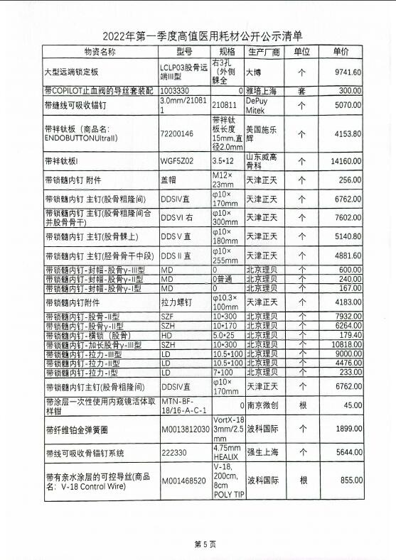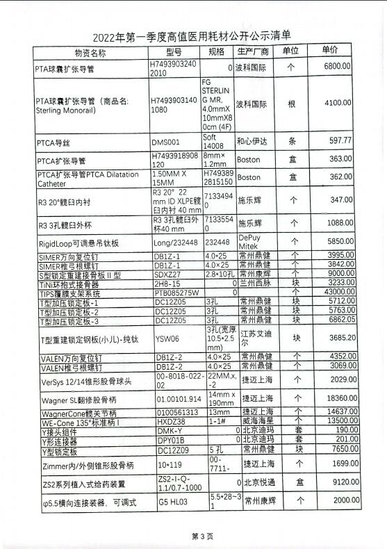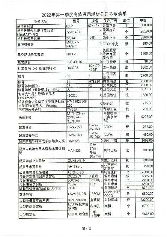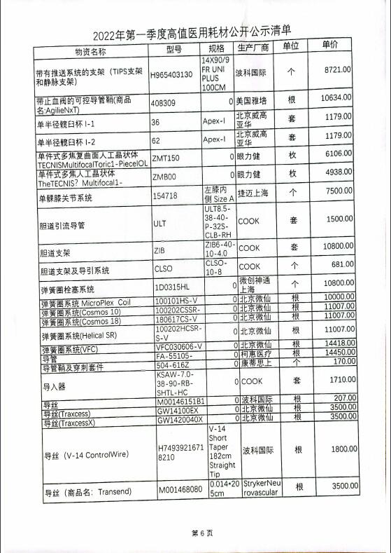 2022年第一季度高值医用耗材公开公示清单